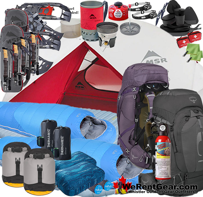 Hike into paradise and camp in beautiful Whistler and incredible Garibaldi Park. With the best quality and highest rated hiking gear money can buy, you will have the trip of a lifetime. We do all the work and you have all the fun! We rent the best quality and highest rated gear on the market. MSR tents, Osprey backpacks, MSR WindBurner Stove Systems, Rab Ascent 700 sleeping bags, Therm-a-Rest XTherm MAX sleeping pads, MSR Evo Ascent snowshoes and more. We also rent complete hiking gear kits. We can equip one person, couples or large groups with everything you need except food and water! We are proud to be Whistler's best source for rental hiking gear. We have the best gear, the best prices and best service!
