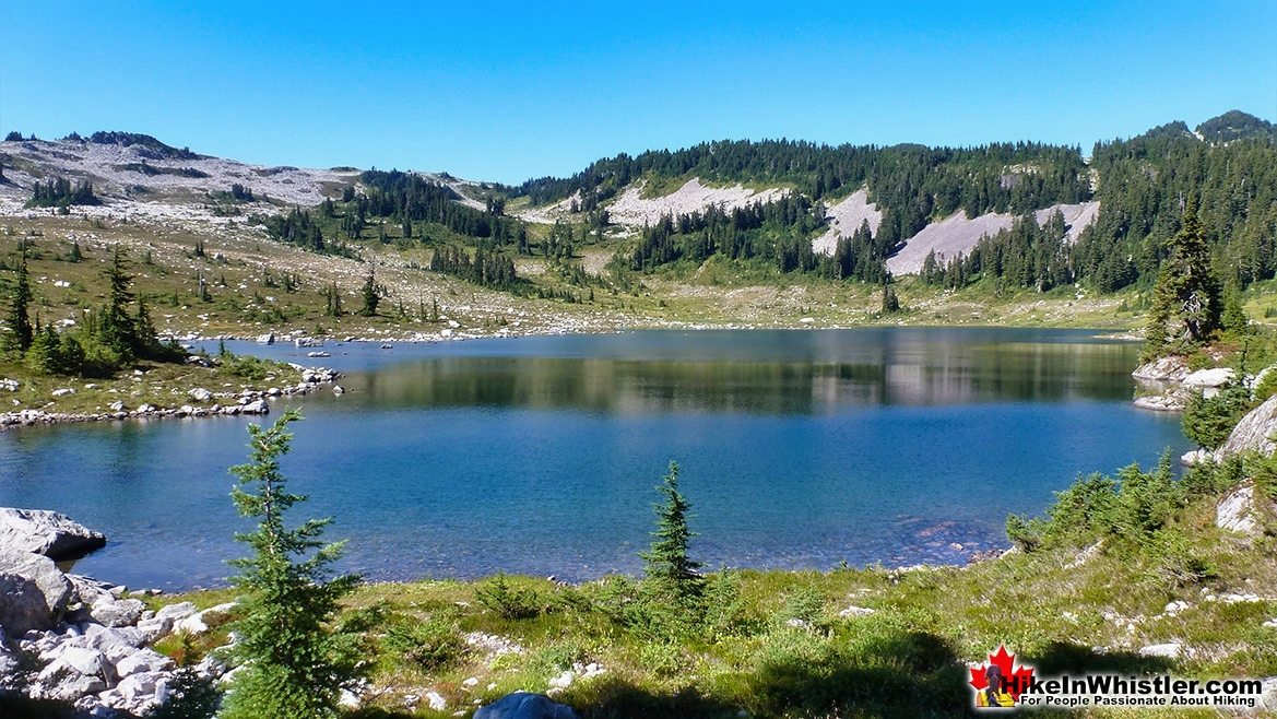 Hiking into this wasteland of erratics reveals an amazing paradise of small, island forests, cute streams and endless worlds within worlds to explore. You find yourself wandering along like a kid mesmerized at what you will find next. Brew Lake itself doesn't come close in wow factor to the postcard-perfect alpine lakes such as Wedgemount Lake, Joffre Lakes, Cheakamus Lake or Garibaldi Lake, but I does beat these lakes in other aspects. Because Brew Lake is outside of Garibaldi Provincial Park few people have heard of it. More often than not you will have both the lake and entire valley to yourself. An increasingly rare occurrence elsewhere that gives the place a quiet calm and that strange and satisfying feeling that there are no other humans for quite some distance. You have that exhilarating wilderness feeling that sometimes gets lost on other Whistler area hikes when you start the trail from a parking lot packed with cars. The fact that the Brew Lake trail doesn't have a parking lot or proper trailhead actually makes it more mysterious, adventurous and in some ways more fun. Brew Lake is shallow and absolutely crystal clear. Mesmerizingly clear. You can look across the lake and see smooth and rounded rocks scattered across the lake bottom. The lake is also relatively small at just a few hundred metres across and unexpectedly warm to swim in. Breathtakingly cold lakes are the norm in the Whistler area, but Brew Lake is an exception. Try swimming in Wedgemount Lake, Joffre Lakes, Russet Lake, Cirque Lake, Cheakamus Lake or Garibaldi Lake for any length of time and you will be shivering cold. You can manage a minute or two swimming in these lakes, but certainly not 20 or 30 minutes as you can in Brew Lake. There are even some massive, flat topped erratics in the lake to swim to and lounge on. The sun makes them amazingly warm on a sunny day. The edge of the lake surrounded by grass areas littered with erratics making it tricky to find a spot for a tent, but easy to find a place to sit. Once you do find a place for your tent, further exploration reveals countless other great spots. Grassy clifftops, clearings at the edge of streams.