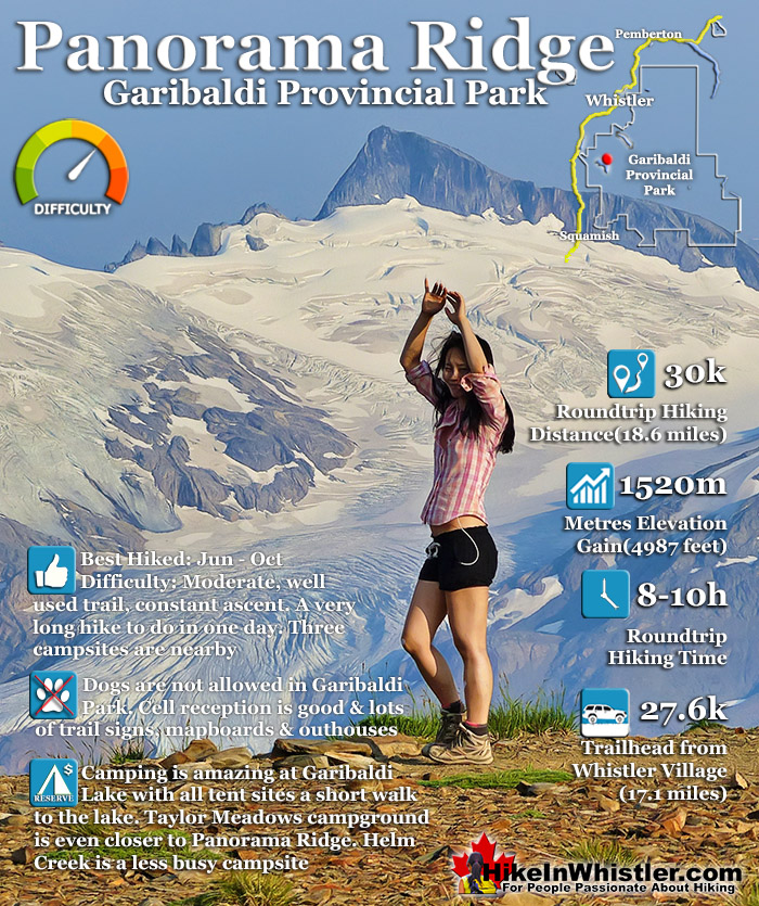 The amazing views start once you reach Taylor Meadows and get even more spectacular as the trail progresses. Once you arrive at Panorama Ridge and its phenomenal vantage point, high above Garibaldi Park, you will stare in wonder. Mesmerized first by Garibaldi Lake, far below you and looking unnaturally blue, the lake looks amazing surrounded by green, untouched wilderness and snow capped mountains. The Table, the massive and unusual looking mountain with its bizarre flat top lays across the lake with the enormous Mount Garibaldi just beyond. In the distance, where Garibaldi Lake ends, a massive glacier rises out of the blue and jagged crevasses can be seen even from such a great distance. Behind you, Black Tusk lays across the valley. Close to the same elevation as Panorama Ridge, you get this wonderful view of it. Certainly the best and closest viewpoint to this iconic mountain. Panorama Ridge sits, along with Black Tusk in the midst of some of the most popular and beautiful hiking trails in Garibaldi Provincial Park. There are two main trailheads for Panorama Ridge, Cheakamus Lake and Rubble Creek. Rubble Creek is the more popular starting point as it is a bit shorter, far more scenic and allows for the inclusion of the trail to Garibaldi Lake and the beautiful Taylor Meadows as well as Black Tusk. The trail to Panorama Ridge from Rubble Creek is not so much difficult as it is long. 30 kilometres makes for a long 8-10 hour roundtrip hike. Staying overnight, therefore is a great idea. There are several excellent options for camping in the valleys around Panorama Ridge. The beautiful though often crowded Garibaldi Lake campsite, the less crowded and also beautiful Taylor Meadows campsite, the seldom crowded and serene Helm Creek campsite (located on the Cheakamus Lake side of Black Tusk). Panorama Ridge stretches for 1.5 kilometres, then drops into an expansive meadow down to Garibaldi Lake and access to the Burton Hut at the far end of the lake. The hut is little used in the summer due to its remoteness. This route, via Panorama Ridge, is the best way to reach this difficult to reach hut in the summer.
