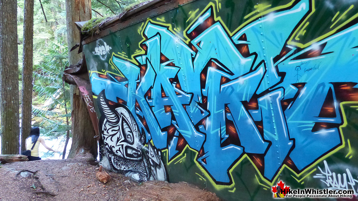 The 33 kilometre Whistler section of the Sea to Sky Trail is either paved, dirt or crushed rock and often very wide. Much of the trail just north and south of Whistler Village is wide, two lanes and paved with plenty of signs and occasional mapboards. North of Whistler Village the trail can be challenging with several hills as it rises above and beyond Parkhurst Ghost Town. South of Whistler, the paved trail ends at Cheakamus Crossing and becomes a narrow at times dirt trail with some wider sections of crushed rock. This beautiful section follows Cheakamus River making four dramatically beautiful river crossings. The Cal-Cheak area south of Cheakamus Crossing is more challenging and sometimes narrow and hilly, dirt trails. South of Cal-Cheak the forest opens up and the trail widens to the luxurious feeling, wide and hard packed gravel all the way to Brandywine Falls Provincial Park where the trail joins with the Sea to Sky Highway. The Whistler section of the Sea to Sky Trail passes near and through an amazing array of whistler sights. The always impressive Brandywine Falls Provincial Park at the southern end of the 33 kilometre area shown here. Heading north from Brandywine Falls you cross the huge bungee jumping bridge that spans the enormous chasm over the Cheakamus River. Soon after you cross the suspension Bridge at the Cal-Cheak Recreation area. At Cheakamus Crossing there are some scenic viewpoints of Cheakamus River and a short detour takes you to the extraordinary Whistler Train Wreck. Back on the Sea to Sky Trail heading towards Whistler Village you pass by three of Whistler's beautiful Lakes each with nice parks. Alpha Lake Park, Nita Lake Park and then on Alta Lake you pass Wayside Park and Lakeside Park.